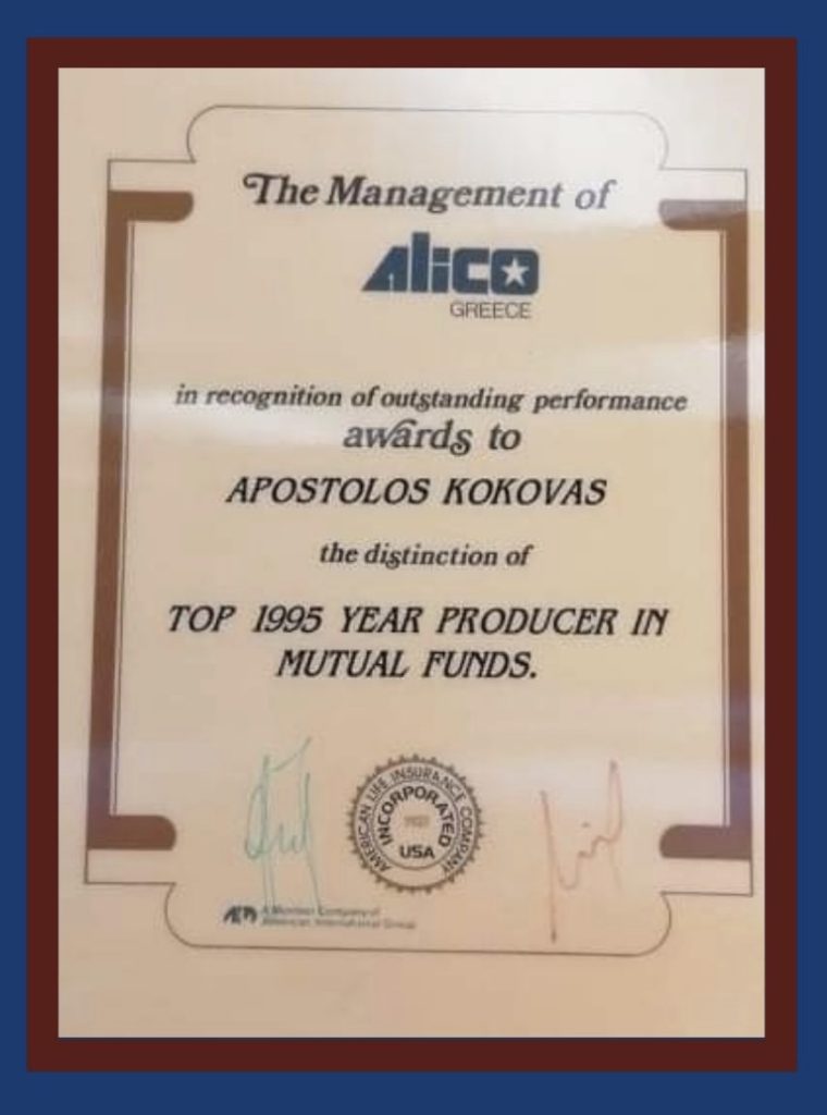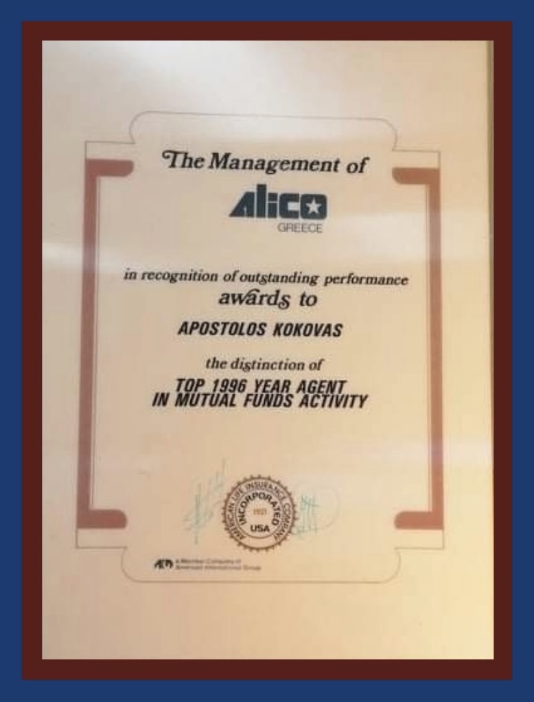 Στην MetLife (Alico) έχει διακριθεί επί σειρά ετών ως πρώτος ασφαλιστής στη Θεσσαλία στις ασφάλειες Ζωής & Υγείας στο υποκατάστημά του.