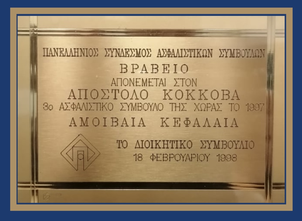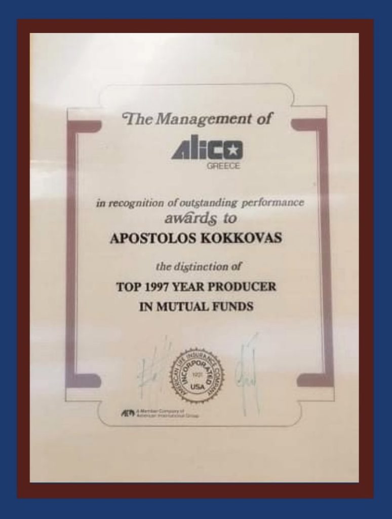 Έχει διακριθεί ως 3ος Ασφαλιστικός – επενδυτικός Σύμβουλος της Χώρας σε παραγωγή Αμοιβαίων Κεφαλαίων το 1997 ανάμεσα σε όλες τις ασφαλιστικές εταιρίες στην Ελλάδα και τιμήθηκε από τον Πανελλήνιο Σύνδεσμο Ασφαλιστικών Συμβούλων με την απονομή βραβείου.
